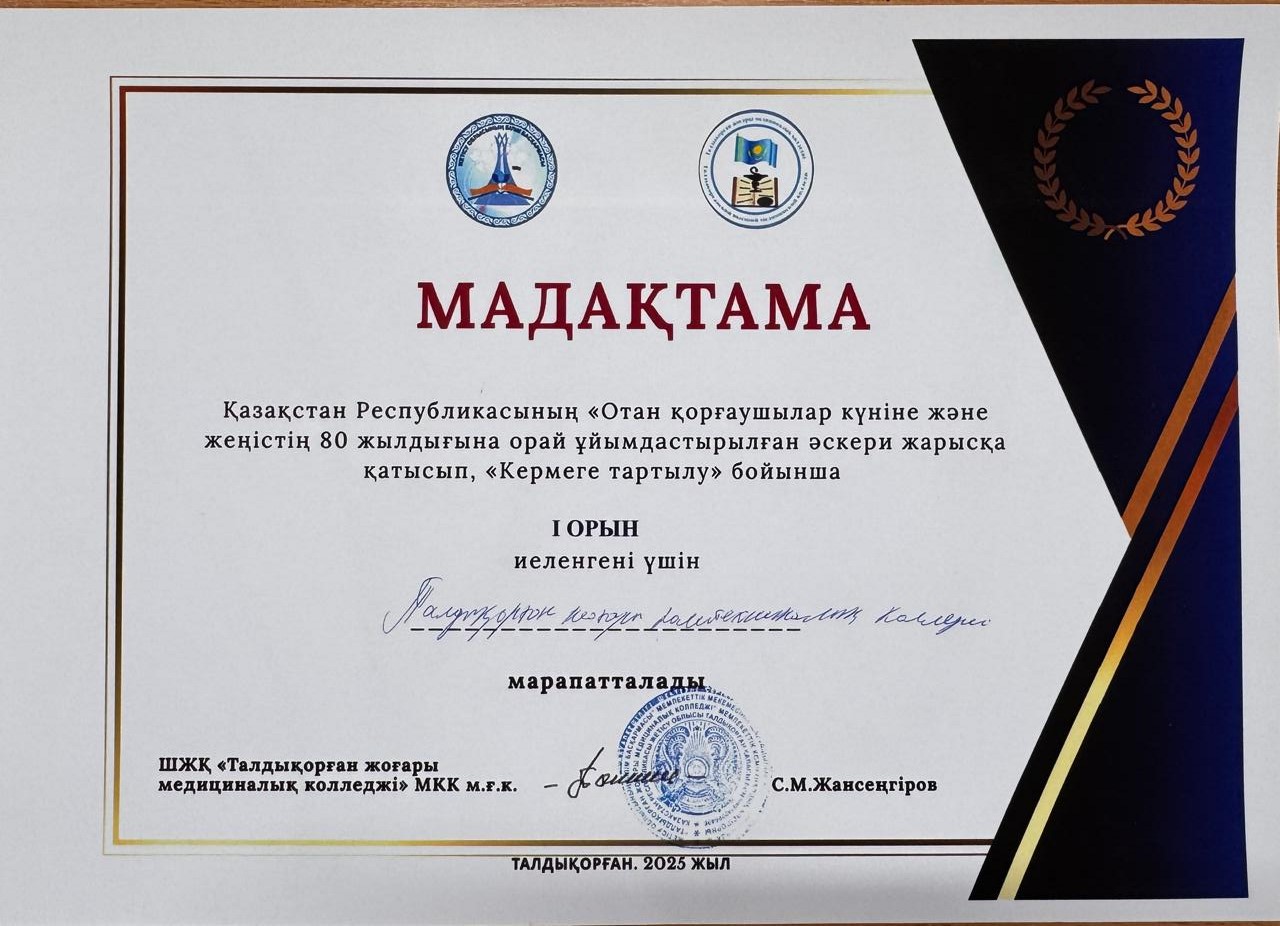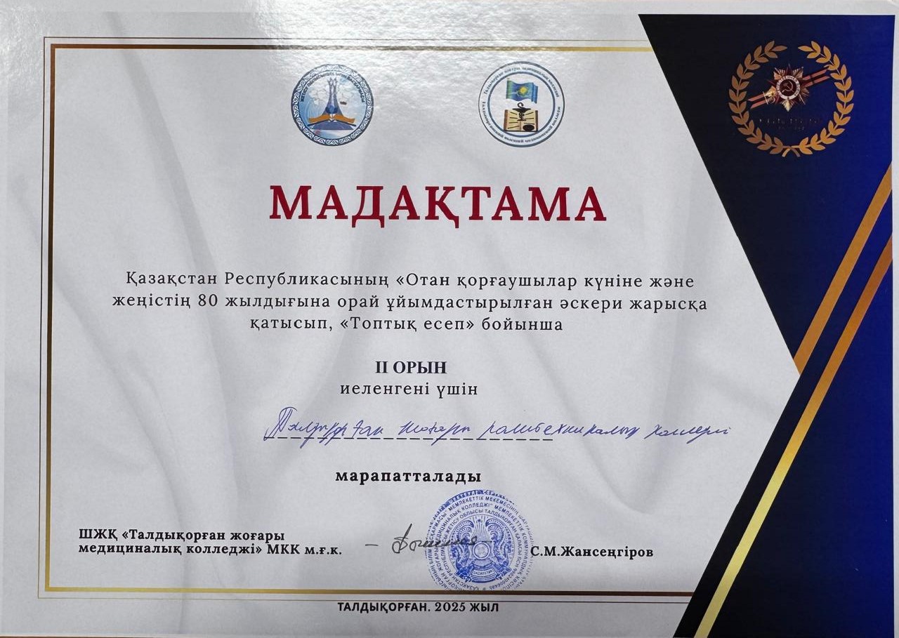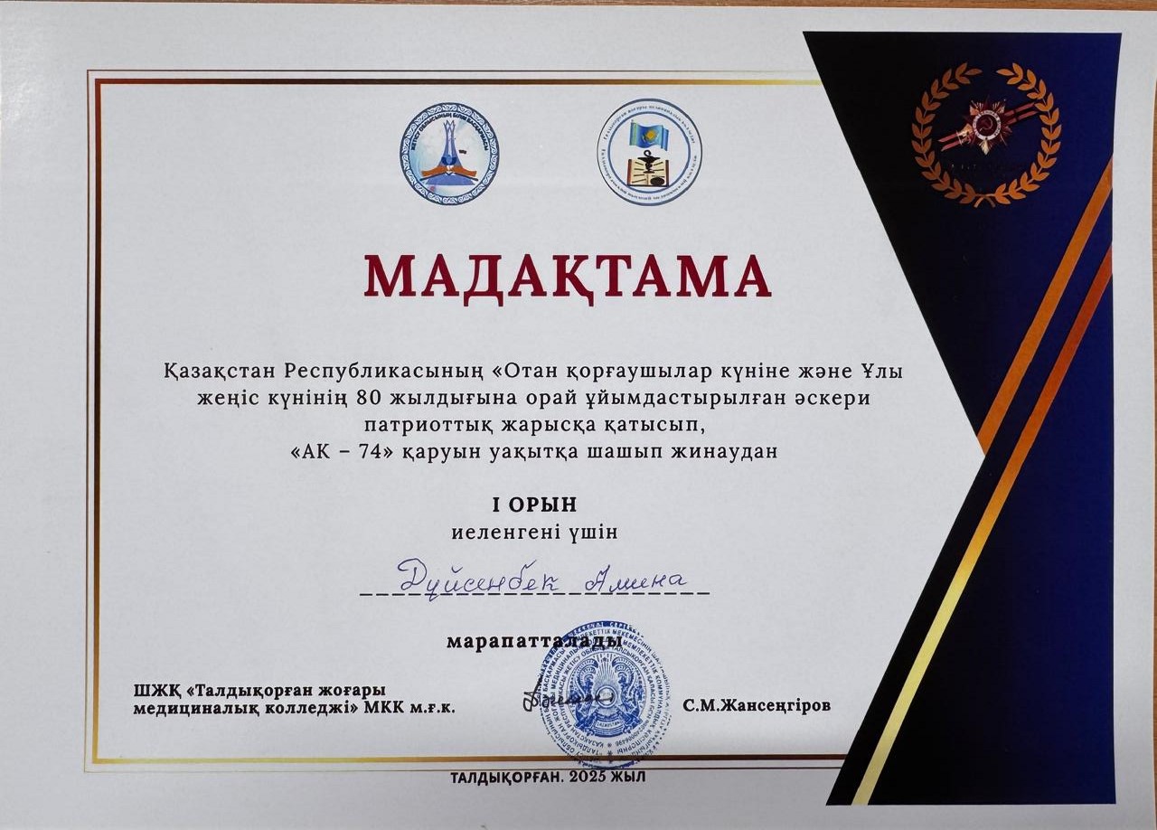 Участвовал в военно-патриотических соревнованиях, посвященных Дню защитника Отечества Республики Казахстан и 80-летию Великой Победы, по «Групповому отчету»