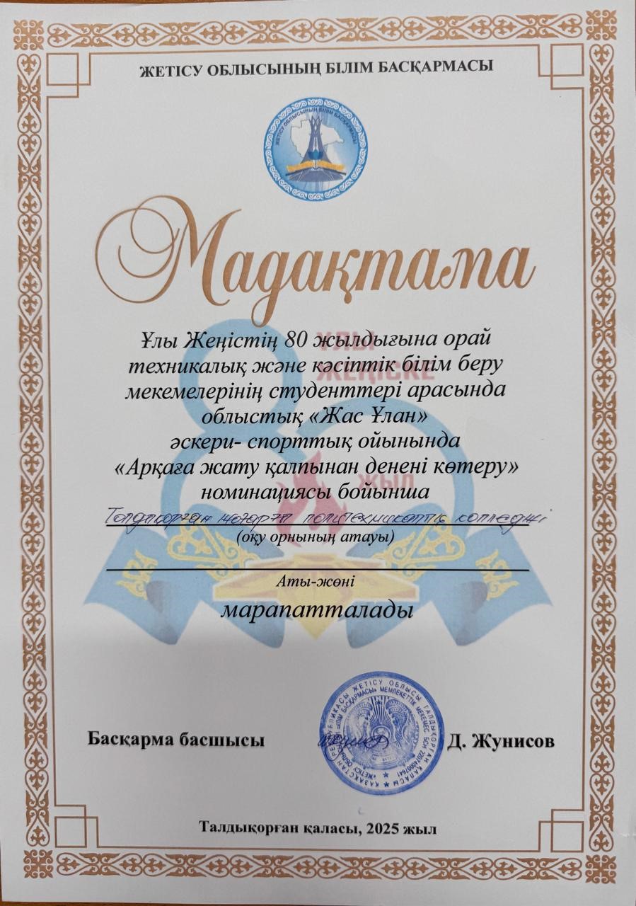 В областной военно-спортивной игре «Жас улан» среди студентов учреждений технического и профессионального образования в честь 80-летия Великой Победы в номинации «подъем тела из положения лежа на спине»