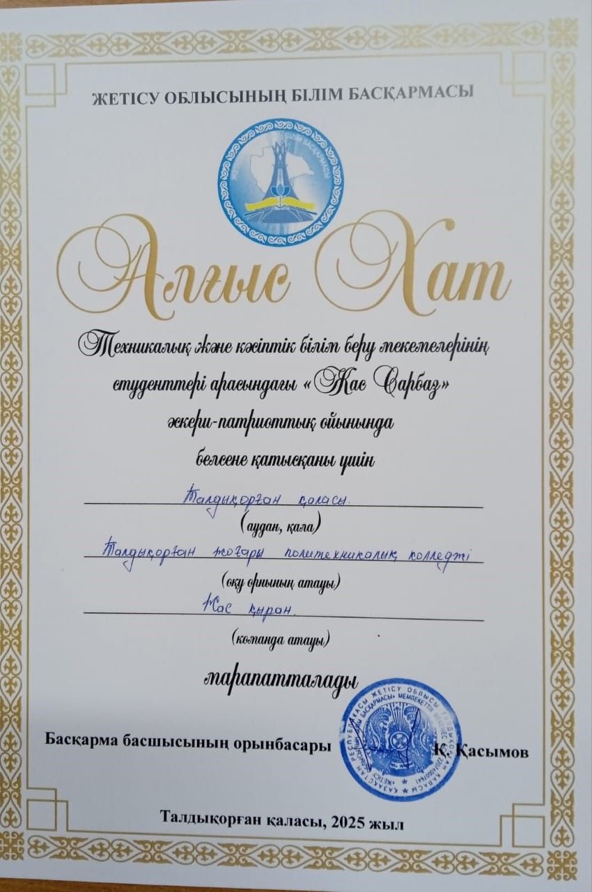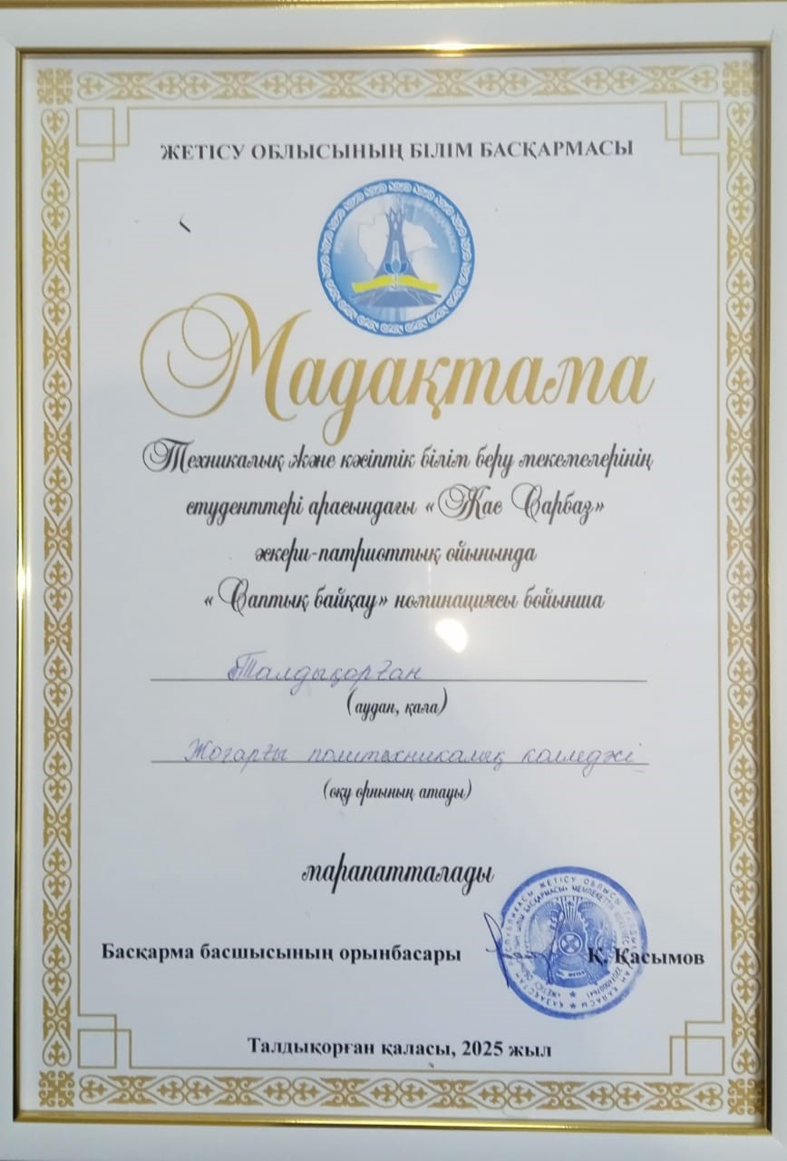 11Научно-практический центр физического воспитания, спорта, начальной военной подготовки и дополнительного образования Управления образования Жетісу области2024Дәрібек ДарханI – место Диплом
